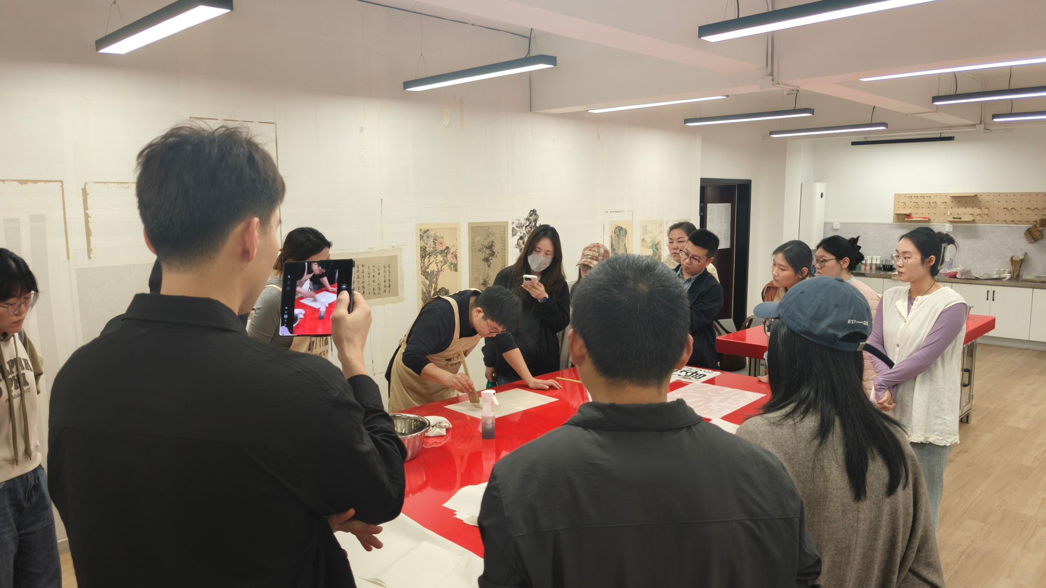 魏方斌以精湛的技艺现场展示了书画装裱和修复中最为核心的托裱工序。针对具有复杂病害的古籍案例,他详细讲解了修复材料的选择逻辑与手法技巧。大家通过近距离观摩实操演示,深刻感受到苏裱技艺中对手感的精准掌控,深切体会传统匠人“择一事,终一生”的严谨态度。演示结束后,参与教师纷纷尝试亲手刷糨糊、托裱画芯等技术,并与魏老师就文物保护技术在教学与科研中的应用展开了讨论,共同探讨了艺术市场发展、数字媒体与文物修复的结合、传统技艺与现代教学的相融等问题。