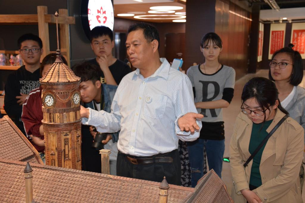 随后,杨会长带领师生们领略手工艺的世界。他为大家详细的介绍了每一件展品,并用栩栩如生的语言,让大家感受到了每一件作品都是一个故事,每一件作品都是时间年轮中最闪耀的一颗星。其中,我们参观了杨会长历时五年用木材雕刻的济南老火车站,作品的精细程度让人震惊。杨会长用心血与情怀诠释了“一件作品唤醒了一座城的记忆”。