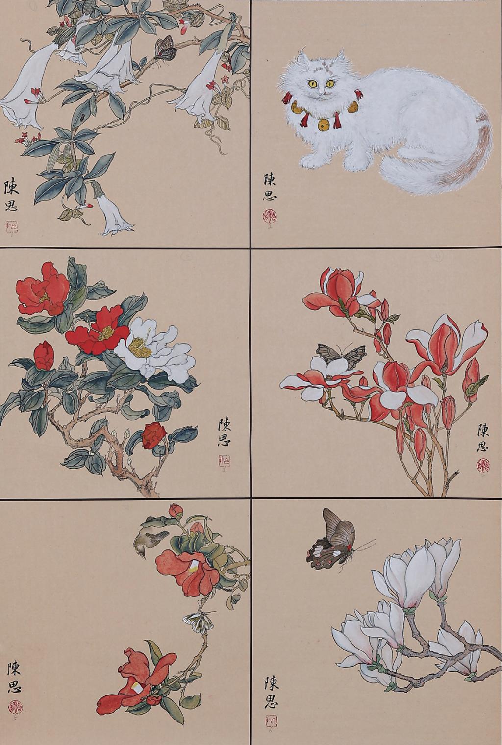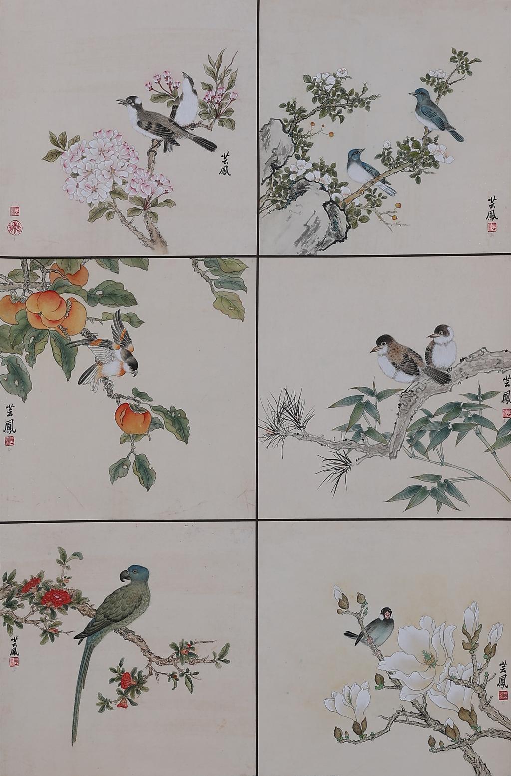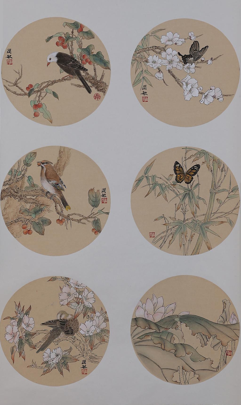The whole piece imitates the way of landscape painting in the works of the Yuan dynasty and consists of six small paintings. The work uses the traditional brushwork of Peima Cun, interspersed with water colours.It is first chapped and then dyed, using ink to divide the structure of the rocks and green to enrich the texture. It is intended to express the dynamic sense of haloing and change in the simple and naïve bushworks, and to create a soul of beauty and spirituality in the quietness of the mood.