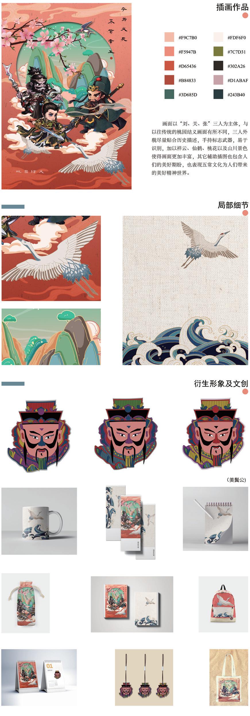 This illustration design uses representative figures "Liu, Guan, Zhang" three people as creative inspiration, the Confucian Wuchang culture has a profound influence in China, and the dynasty of the material prototype is the Han Dynasty. Deeply influenced by Confucianism, Liu Bei and Guan Yu, who were virtuous and courteous, and faithful and righteous, became sworn friends with Zhang Fei taoyuan, setting a benchmark for later generations in life, and their way of life was the realistic expression of the Confucian five constant thoughts. Therefore, Wuchang illustration selects representative figures for illustration creation publicity, aiming to make it more modern and interesting, and attract more people to pay attention to and love. The creation of illustration adopts a more cartoon form to make the picture different from the traditional character image in the past, which can provide some reference for its modern communication.