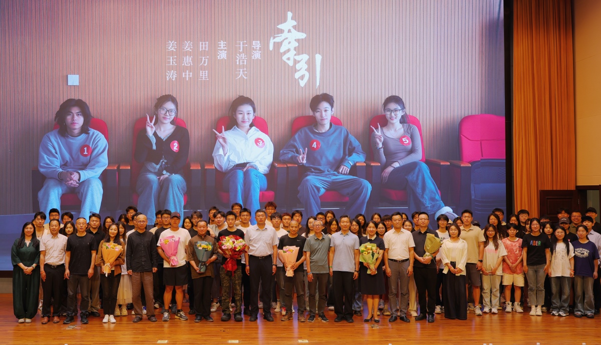、向于浩天同学及亲朋好友、全体演职人员表示热烈祝贺。他谈到,这是我校历史上首次为在校学生举办的首映仪式,充分展示了我校坚持兼容并包、全面培养学生综合素养的育人导向,也是我校多年来坚持文化立校、文化强校战略,全面深化校园美育浸润和人文精神涵养,坚持五育并举、促进学生全面成长成才的一个范例,学校将始终为有青春梦想、创新热情和专业特长的学生搭建广阔的舞台和平台。于浩天同学作为一名普通的本科学生,出于对电影艺术的执着与热爱,也出于对中国传统文化的痴迷与敬仰,坚守初心,笃行不怠,终于能够十年磨一剑,在本科毕业前,导演完成了个人在艺术生涯中的微电影处女作《牵引》,影片高唱主旋律,题材新颖、内涵丰富,拍摄剪辑水准高,观影效果非常好,是我校在校学生第一个独立导演完成的电影作品,非常值得鼓励和赞扬。于浩天本身就是我校四年本科教育的一件成功作品,也是学校积极践行家校融合、行业与专业融合,多措并举协同育人的一个成功作品。希望广大青年学生要忠于梦想,积极实践,勇于追梦、筑梦、圆梦,用孜孜以求的不懈奋斗谱写绚烂多彩的青春华章。