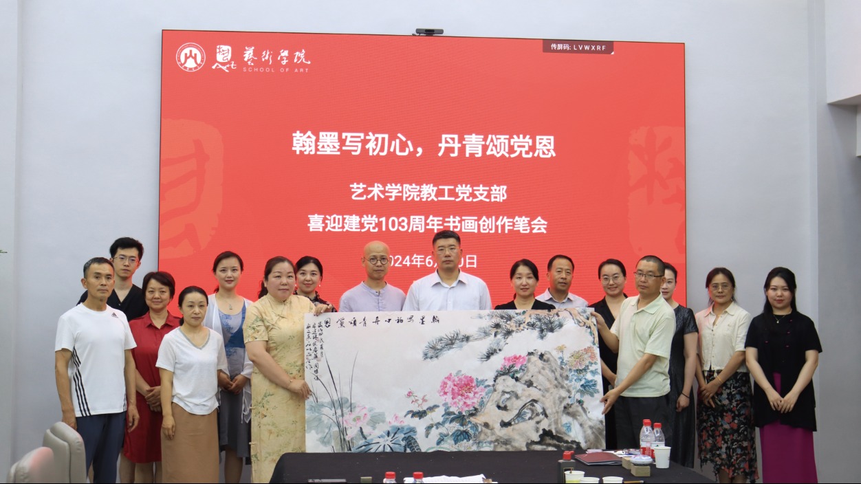在笔会现场,教工党员挥毫泼墨、点染丹青,提笔抒怀、以画寄情,创作出一幅幅饱含深情的艺术作品,特别是集体创作的六只国画作品,以松竹牡丹为基本构图,笔法娴熟,色彩缤纷、表达了对党的无限热爱、对祖国的深情祝福和对未来生活的美好向往。